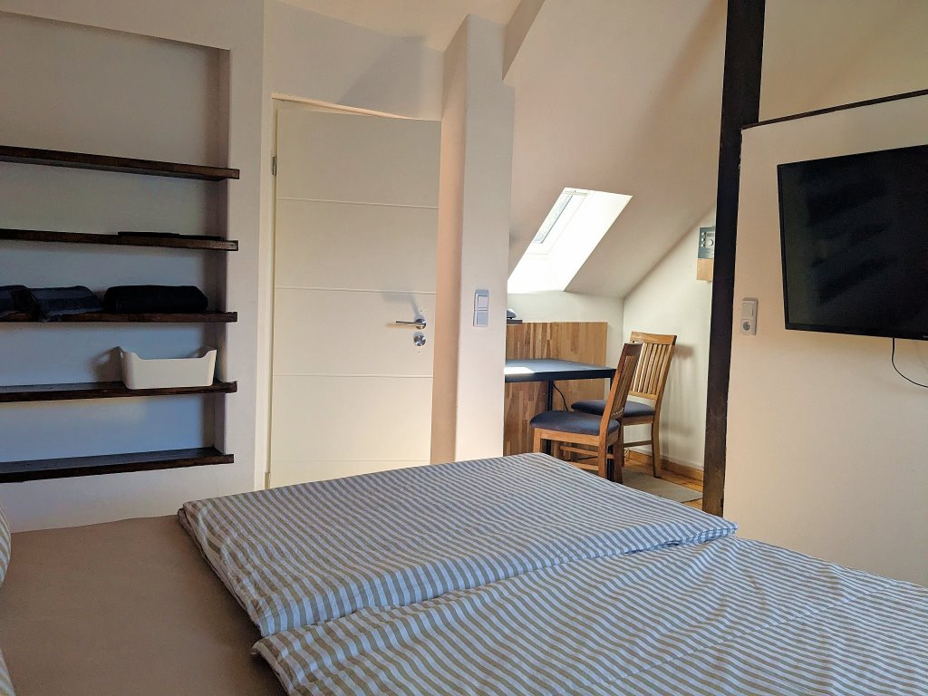 Willkommen in unserem freundlichen Doppelzimmer "Schwarze Katz" im Dachgeschoss (3. Etage) unseres Gästehauses Zeller Altstadt! Auf 15 m² erwartet Sie eine behagliche Rückzugsoase für zwei Personen. Der kombinierte Wohn- und Schlafbereich ist ausgestattet mit einem komfortablen Doppelbett (180 x 200 cm), einem praktischen Kleiderschrank und liebevoll ausgewählter Bettwäsche – für erholsame Nächte. Ein kleiner Essplatz mit Tisch und zwei Stühlen lädt zu einem entspannten Frühstück ein. Im Bad stehen Ihnen Dusche, WC, Waschbecken, Spiegel, Föhn sowie Hand- und Duschtücher und Handseife zur Verfügung – alles, was Sie für einen angenehmen Kurzaufenthalt benötigen. Zur Unterhaltung gibt es einen Flachbildfernseher mit Satellitenempfang, und dank kostenfreiem WLAN bleiben Sie jederzeit gut verbunden.